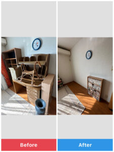 退去期限が迫っていたため、仕分け→搬出→清掃まで一括対応し、短時間で完了しました。